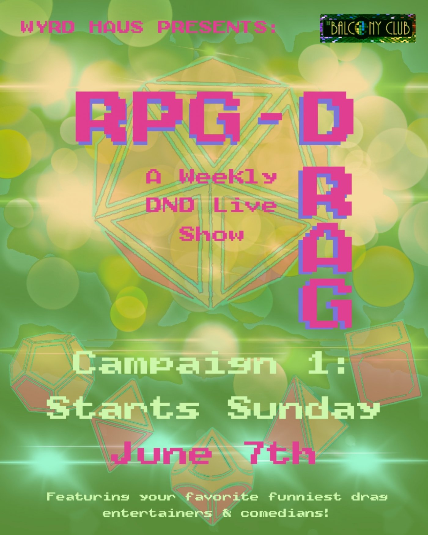 WELCOME TO RPG-D! The Tabletop Roleplaying Game Performed and Hosted by your favorite drag entertainers, comedians, and nerdy improv artists! Every week is a new adventure using the mechanics of some of the most popular TTRPGs around—DND, Call of Cthulhu, Starfinder, and Dread to name a few. So, grab those drinks, roll your dice, and prepare for the chaotic action!!
