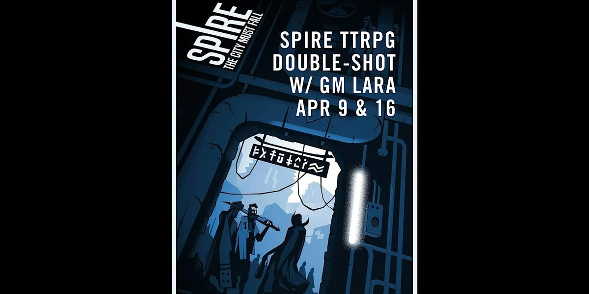 Spire is a story-focused, balanced rule system that is easy to pick up and get obsessed with. Play materials will be available for everyone, but if you’d like to bring your own, bust out 5d10, a d6, and a d8.