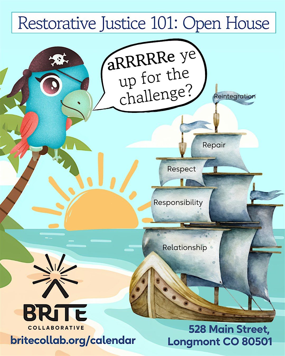 Join us for this free, open-house style event to learn the basics of Restorative Justice with fun interactive PIRATE games and a treasure hunt to uncover all the 'R's. Completed treasure hunts lists will be entered into a drawing for prizes!