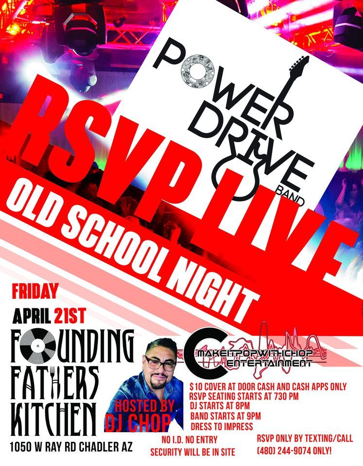 Come out for some live music by one of the valley’s best old school and Latin bands Powerdrive Friday April 21st 9pm - 2am. This event is hosted by DJ Chop w/DJ Rico Makeitpopwithchopdjs. This is 21+ only! RSVP ONLY @ Makeitpopwithchop.com, call or text (480)244-9074.