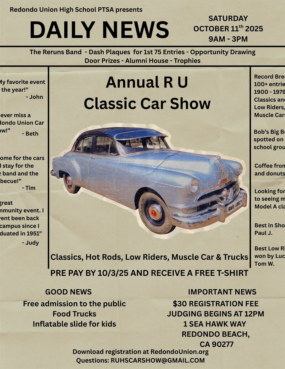Cruise on over to Redondo Union High School on October 11, 2025 at 9:00 AM for a day filled with vintage cars, low riders, hot rods and good vibes. Get ready to admire some classic beauties and chat with fellow car enthusiasts.