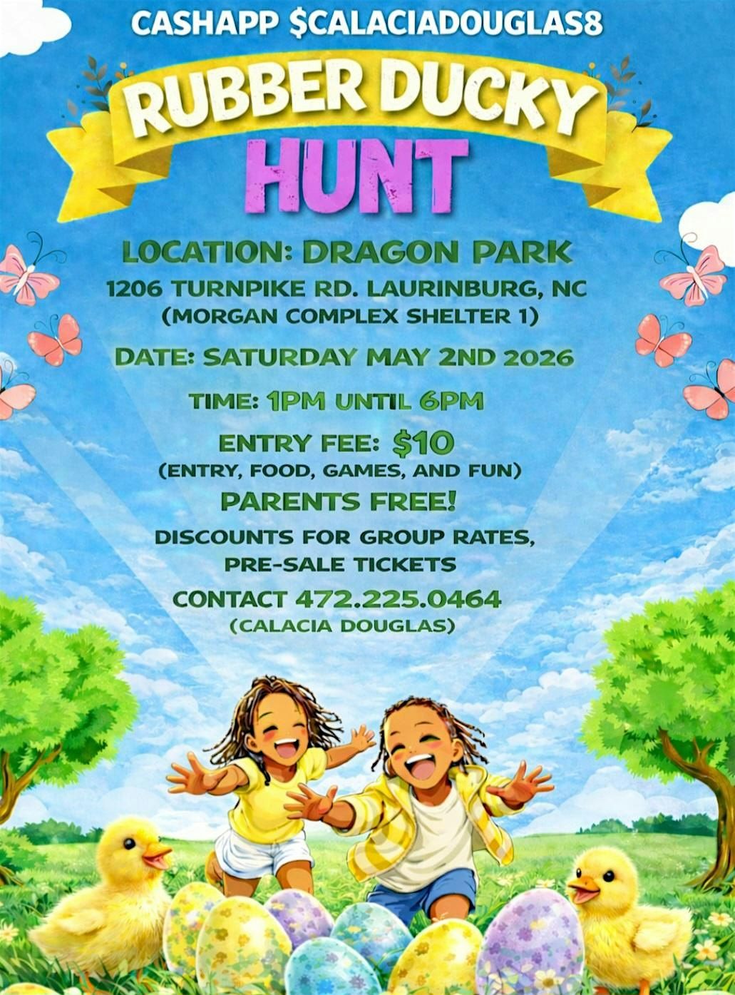 Join us for a fun and casual Rubber Ducky Hunt at 1206 Turnpike Rd Laurinburg, NC! Bring your friends and family to enjoy an exciting afternoon searching for those silly little ducks. It's all about laughs, teamwork, and a splash of friendly competition.