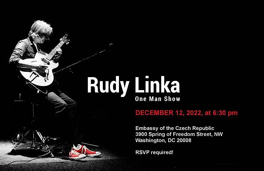 The Embassy of the Czech Republic invites you to "One Man Show - Between the Lines," featuring world-renowned guitarist Rudy Linka on December 12, 2022, at 6:30 pm.