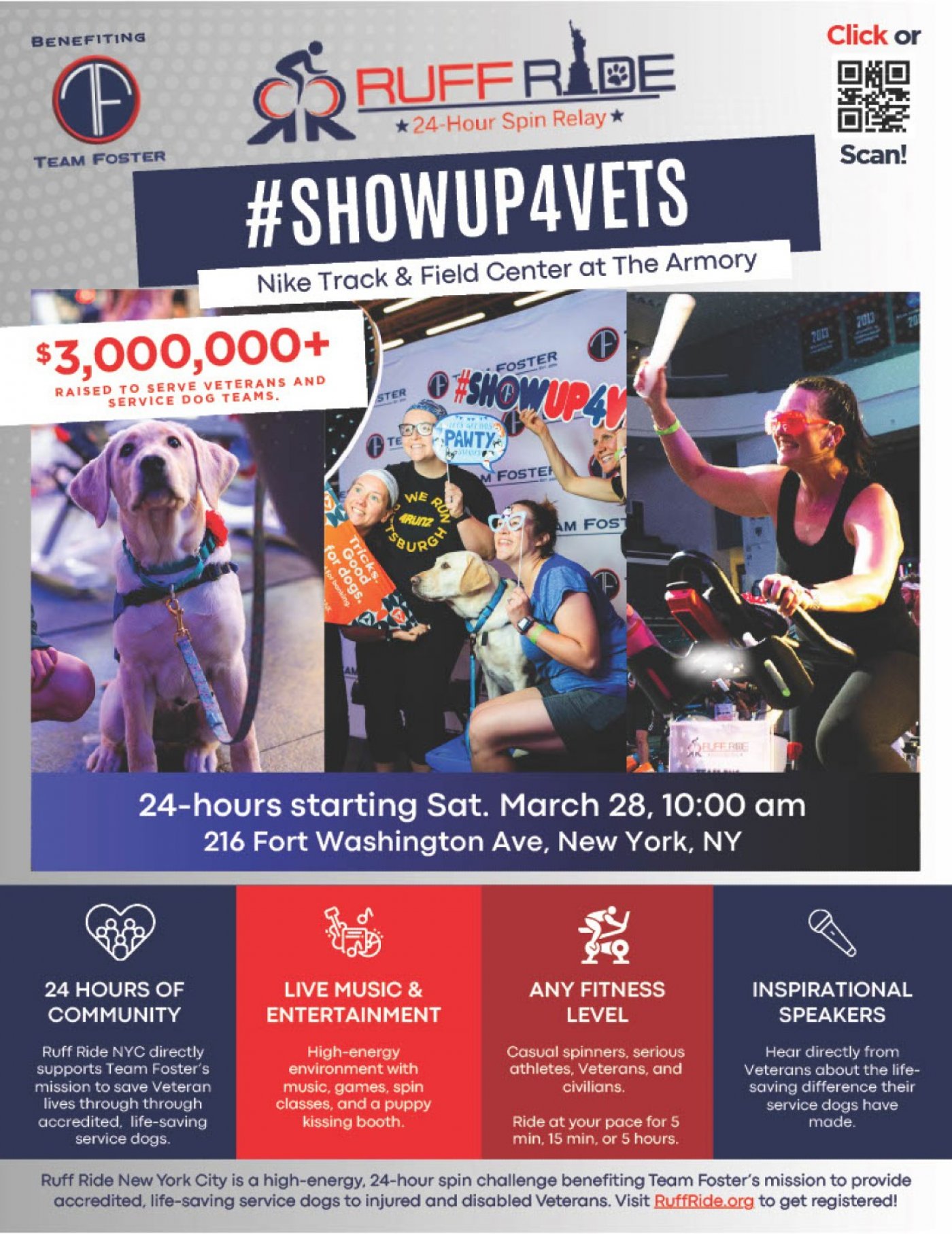Ruff Ride is a 24-hour stationary cycling relay—part festival, part competition—where teams rally their communities and raise critical funds to provide service dogs for veterans. Throughout the full 24 hours, cyclists, volunteers, supporters, and spectators will be onsite, creating a vibrant, high-energy environment.