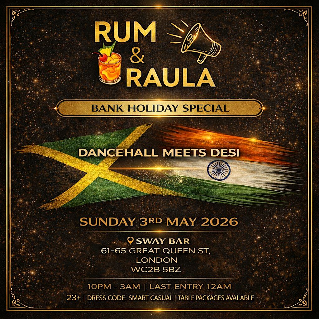 RUM & RAULA brings together Dancehall and Desi sounds for a Bank Holiday night in Central London.