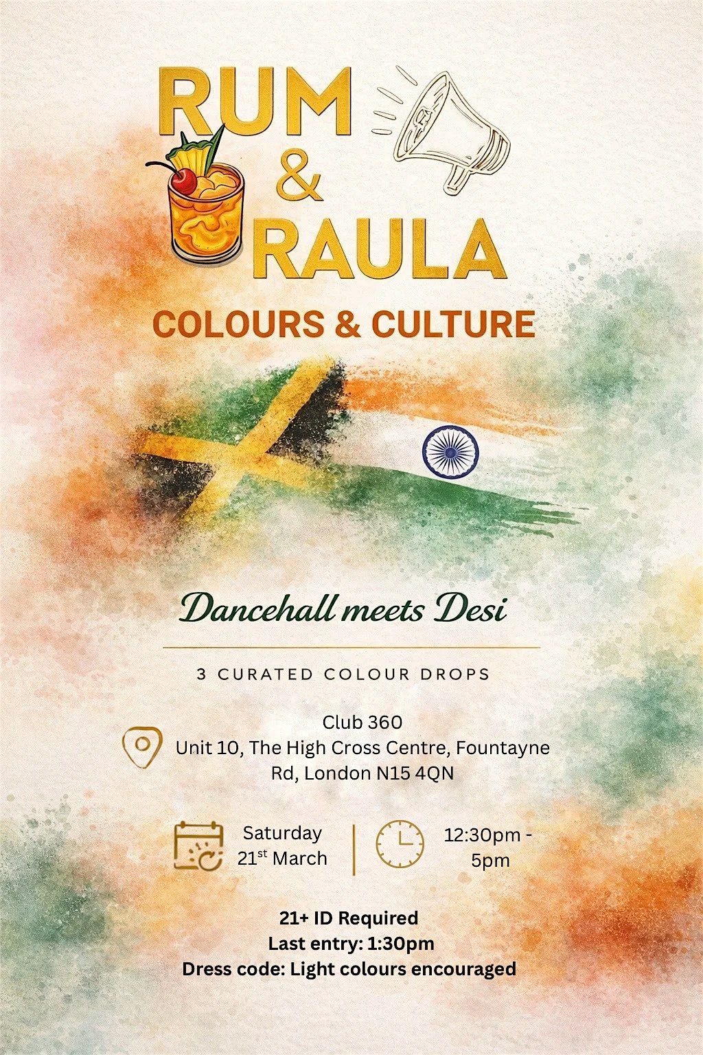 A curated day party blending Dancehall x Desi x R&B, with 3 controlled colour drop moments throughout the event.