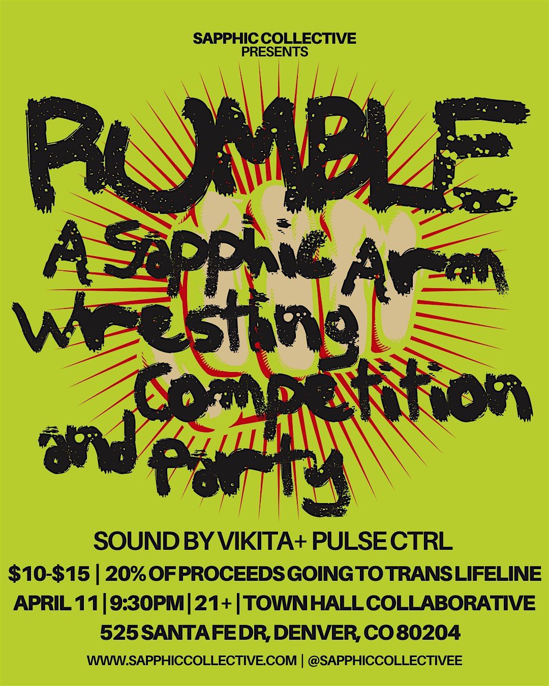 A sapphic/queer arm wrestling event - everyone is welcome to participate! Competitors will sign up beforehand (information to be posted on @sapphiccollectivee 's Instagram), and it will be a bracket style competition.