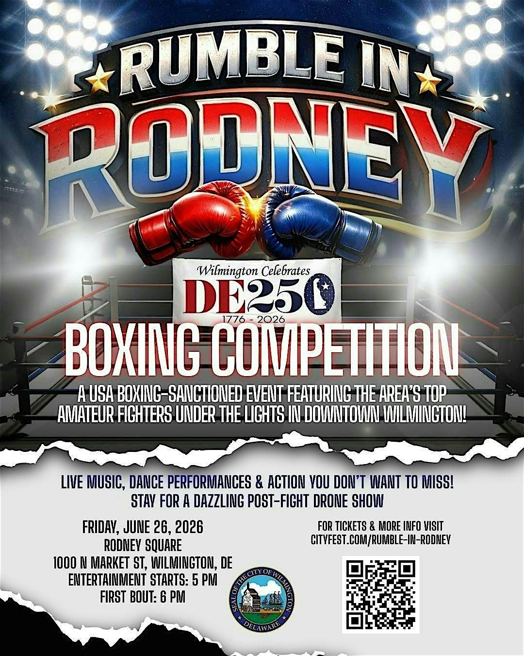 On Friday, June 26, live boxing will take place on Wilmington’s Rodney Square for the first time. Rumble in Rodney will feature the area’s top amateur boxers competing under the lights in a USA Boxing-sanctioned event. There will be live music, food trucks, past boxing greats, sports & entertainment celebrities & more. The evening will end in spectacular fashion with a drone show over the historic Court House. Twelve to 15 bouts scheduled. First bout: 6pm.
