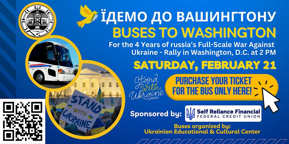 Attention! You are purchasing a round-trip ticket for the bus to Washington, DC, Lincoln Memorial. The Ukrainian community will meet at 2 pm at the Lincoln Memorial to hold a mass rally to mark the 4th-year anniversary of russia's full-scale invasion of Ukraine. The buses are chartered by the Ukrainian Educational and Cultural Center, together with the most generous sponsorship support of the Self Reliance Financial Federal Credit Union (SRFFCU). Logistical coordination with the rally organizers in Washington, DC, is being supported by the Honorary Consul of Ukraine in Philadelphia, Iryna Mazur.