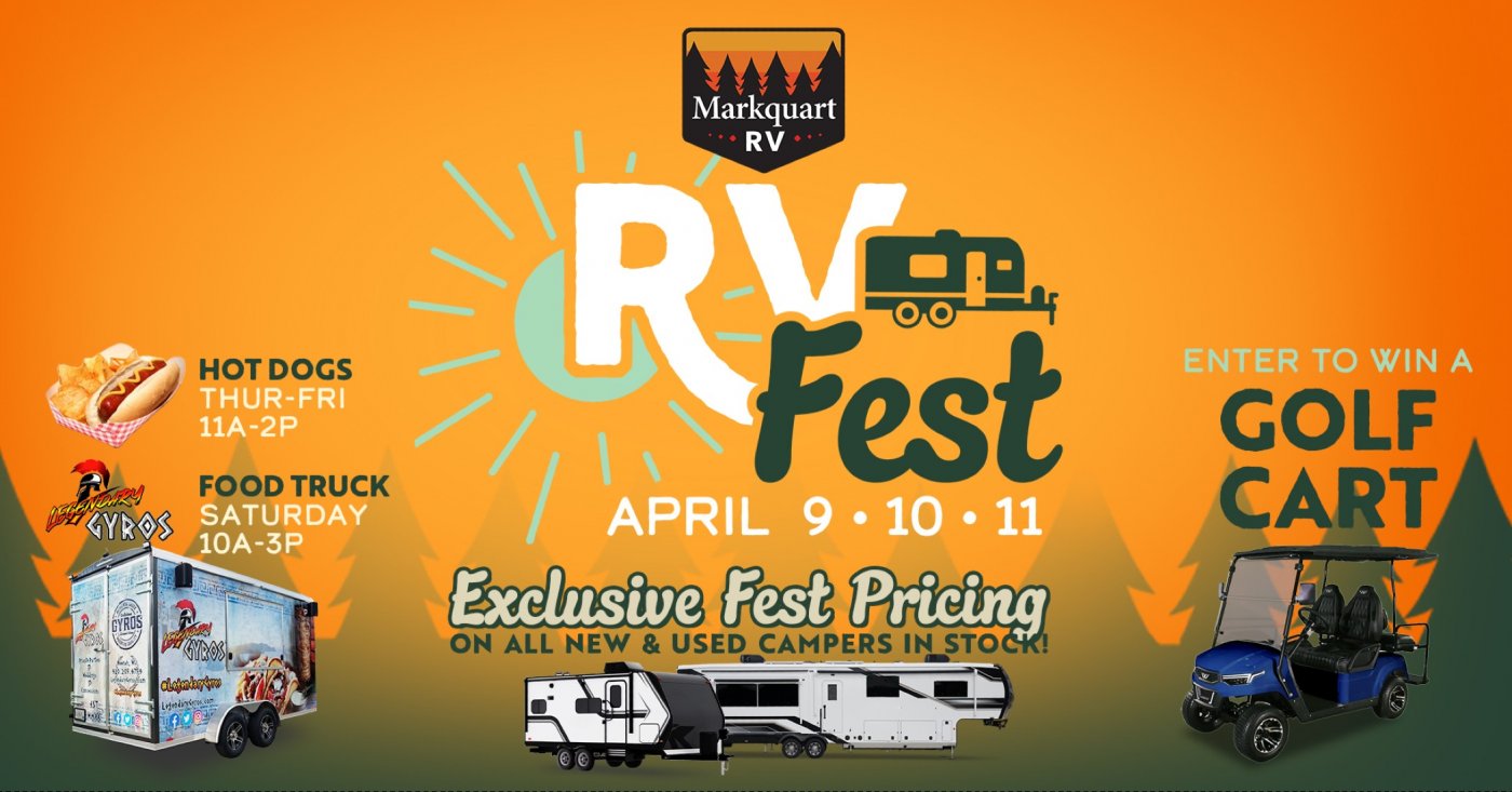 Bring the whole family to Markquart RV - Appleton’s RV Fest April 9th through 11th only! Take advantage of exclusive Fest pricing on all new and used campers in stock! Enter to win a golf cart, jump in the bounce house, and enjoy free admission and free parking. Grab a hot dog or snack on Thursday and Friday from 11am-2pm, and the Legendary Gyro's Food Truck will have lunch available for purchase on Saturday from 10am - 3pm.