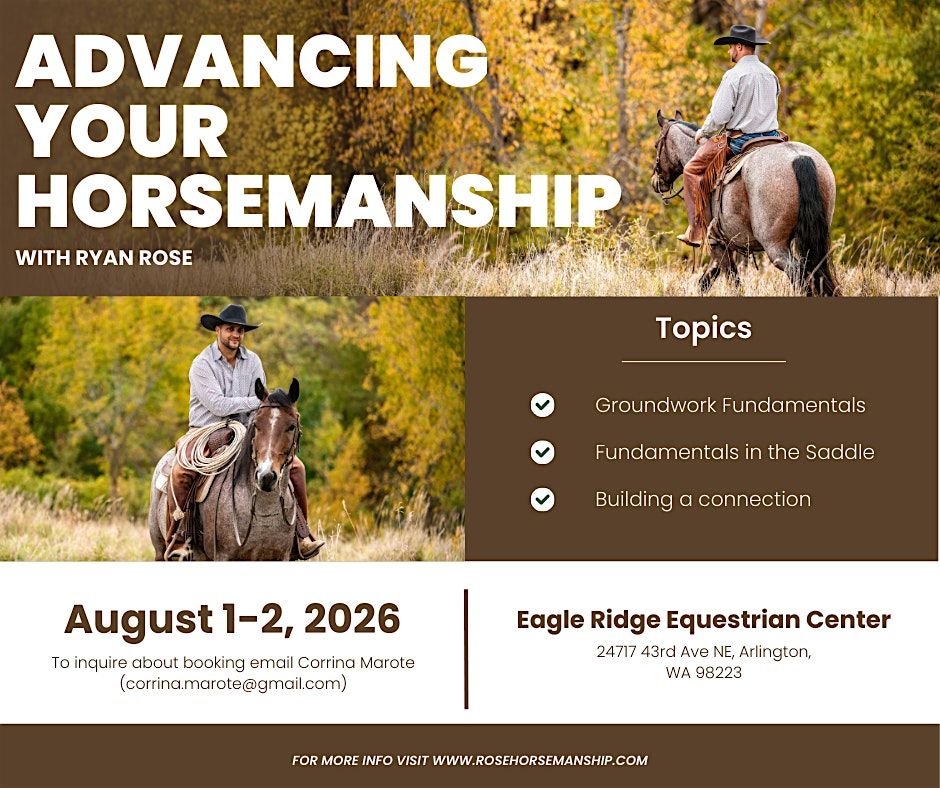 Come join us for the Ryan Rose Horsemanship Clinic at the beautiful Eagle Ridge Equestrian Center! Whether you're a beginner or an experienced rider, this event is perfect for anyone looking to improve their horsemanship skills. Ryan Rose, a renowned horse trainer, will be sharing valuable insights and techniques to help you build a stronger bond with your equine partner. Don't miss out on this opportunity to learn from the best in the industry! See you there!