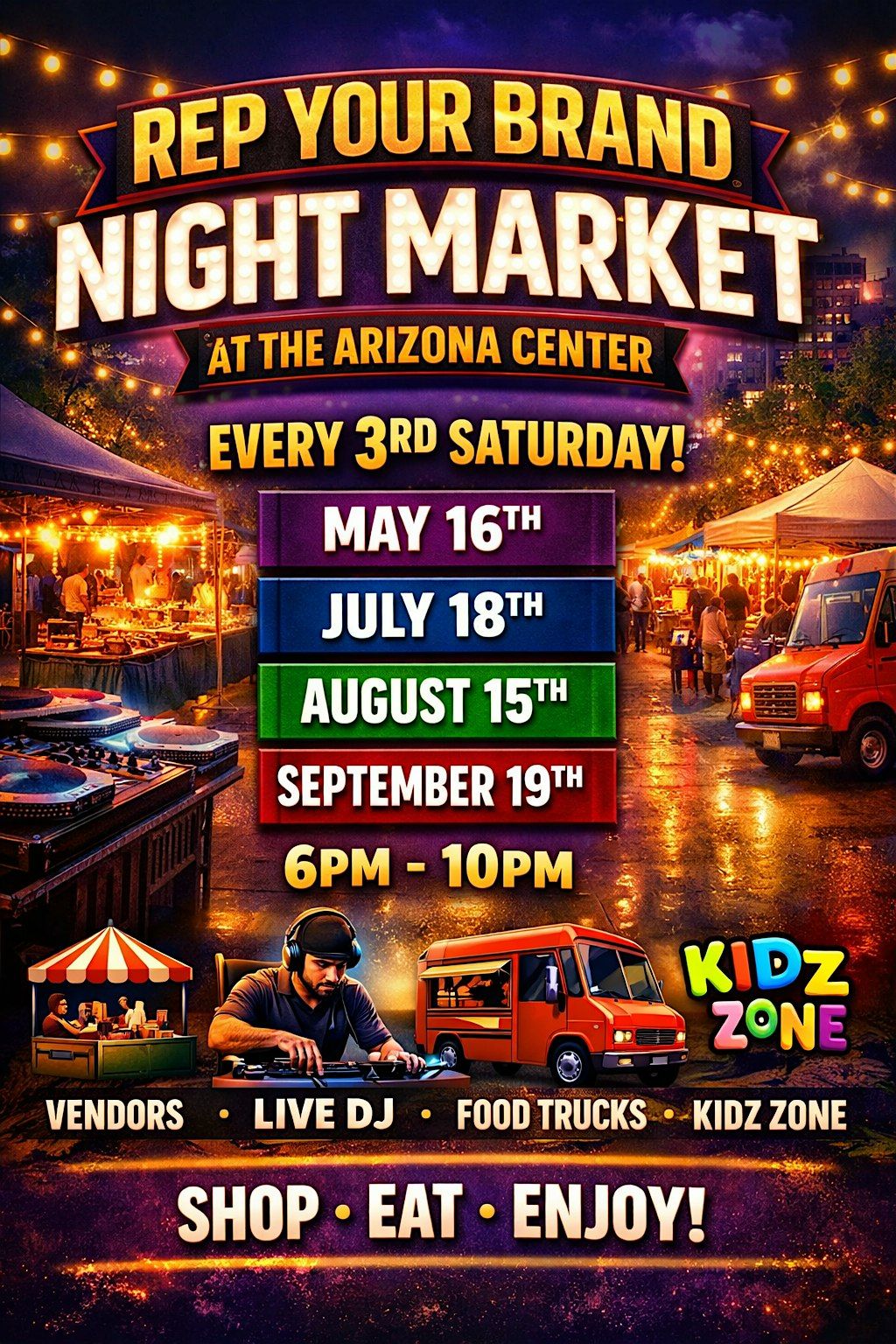 We’re bringing the energy back to the Arizona Center every 3rd Saturday for an unforgettable night of shopping, music, food, and family fun!Come out and support local vendors, vibe to a live DJ, grab a bite from amazing food trucks, and let the kids enjoy the Kidz Zone while you shop and connect. This is the perfect place to rep your brand, discover new businesses, and enjoy the community atmosphere.