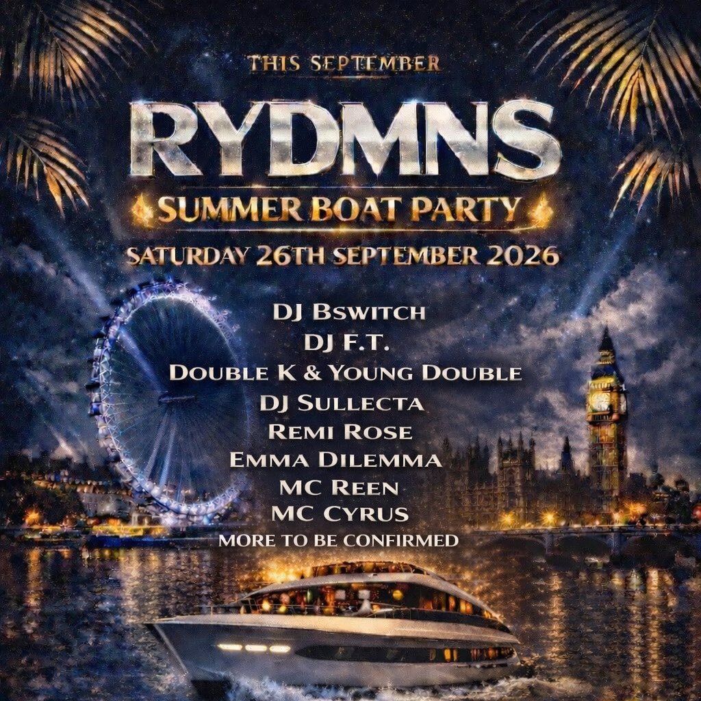 Step into an exclusive experience on the water, where music, atmosphere and elegance come together. The RYDMNS Boat PartyMusic Genres : House, UK Garage, Drum and Bass, Tech House, Dancehall