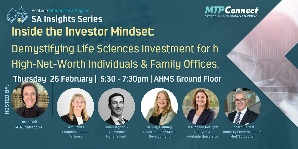 Join Adelaide Intermediary Program Director, Dana Bell for an SA Insights fireside chat and networking evening exploring how high-net-worth individuals (HNWI) and family offices invest, including in life sciences — and what sets them apart from other sources of capital.