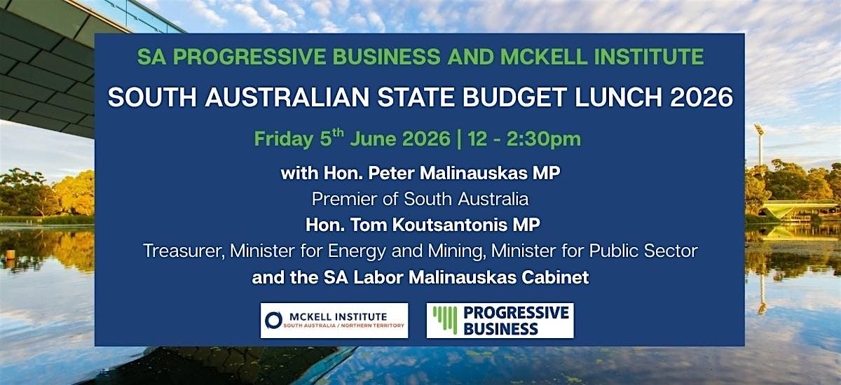 The SA Progressive Business and McKell Institute State Budget Lunch 2026 will feature the South Australian State Treasurer's first official address outside State Parliament after handing down the 2026/2027 South Australian State Budget, to be released on Thursday 4th June.