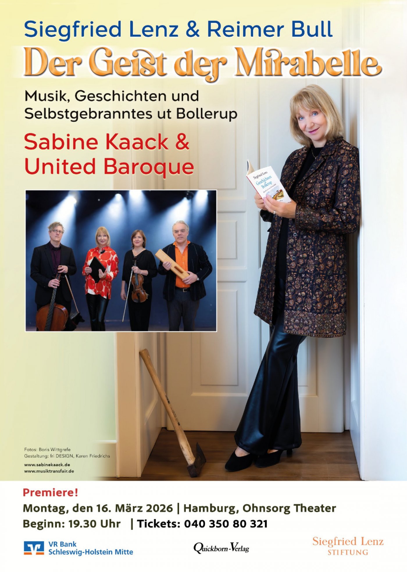 Leise knarzen die Dielen. Das Fettnäpfchen zerdeppert schrill. Mit Wucht saust eine Axt herab. Spannung, Schreck und Schadenfreude wechseln sich ab, faszinieren das Publikum. Eingerahmt von barocken Klängen. Leidenschaftlich und charmant arrangiert Schauspielerin Sabine Kaack (67) zum 100. Geburtstag von Siegfried Lenz ihr Literatur-Konzert ‚Sabine Kaack & United Baroque - Der Geist der Mirabelle‘. Die Deutschland-Premiere ist am Montag, den 16. März 2026, im Ohnsorg Theater in Hamburg auf Plattdeutsch.