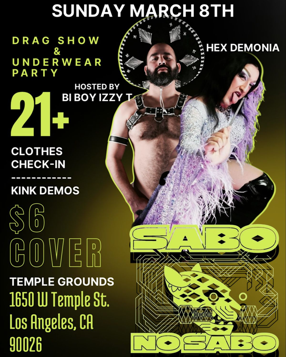 Sabo No Sabo is a party focusing on cultural awareness and Kink positivity. Our parties are high energy with a DJ, Go Go Dancers, and Drag performances. Our event also includes Kink Demos, clothes check, vendors from the community and resources like HIV/STI testing.