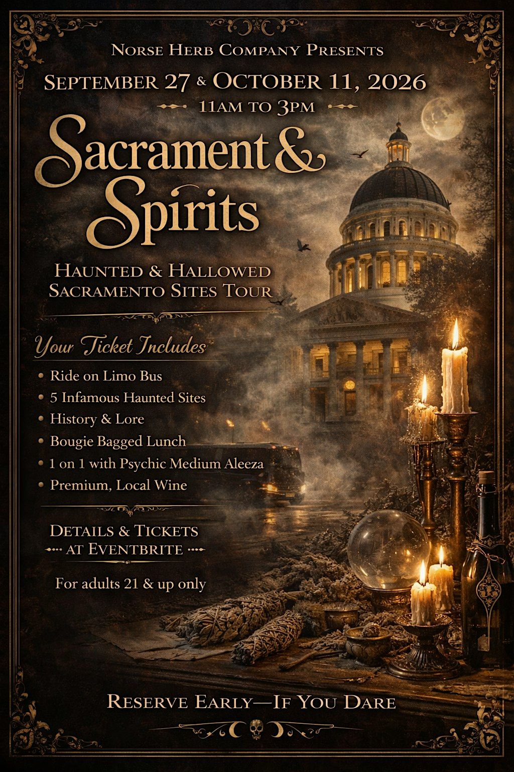Join psychic medim Aleeza onboard a limo bus for a tour that includes five infamous haunted sites in Sacramento.