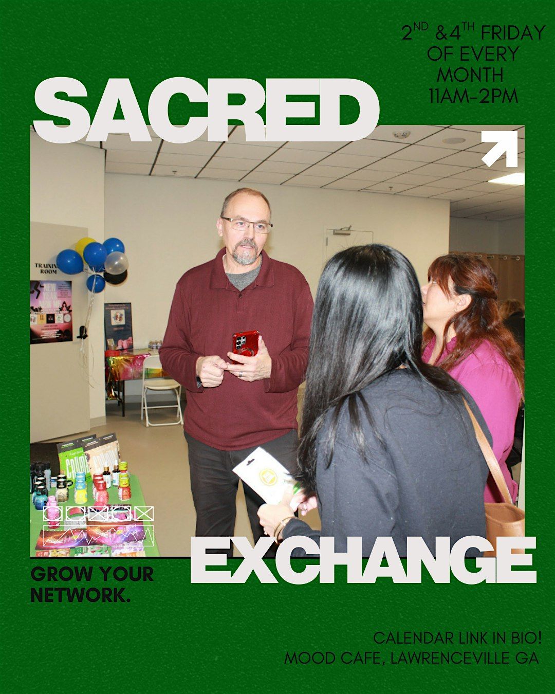 Welcome to Sacred Exchange-CEO Social Club happening at Mood Cafe EVERY OTHER FRIDAY, 11AM - 1PM(Eastern Time)! Join us for a day of networking, learning, and fun. Connect with other CEOs, share experiences, and gain valuable insights. Don't miss out on this opportunity to expand your professional circle and enjoy delicious drinks and treats at Mood Cafe. See you there!