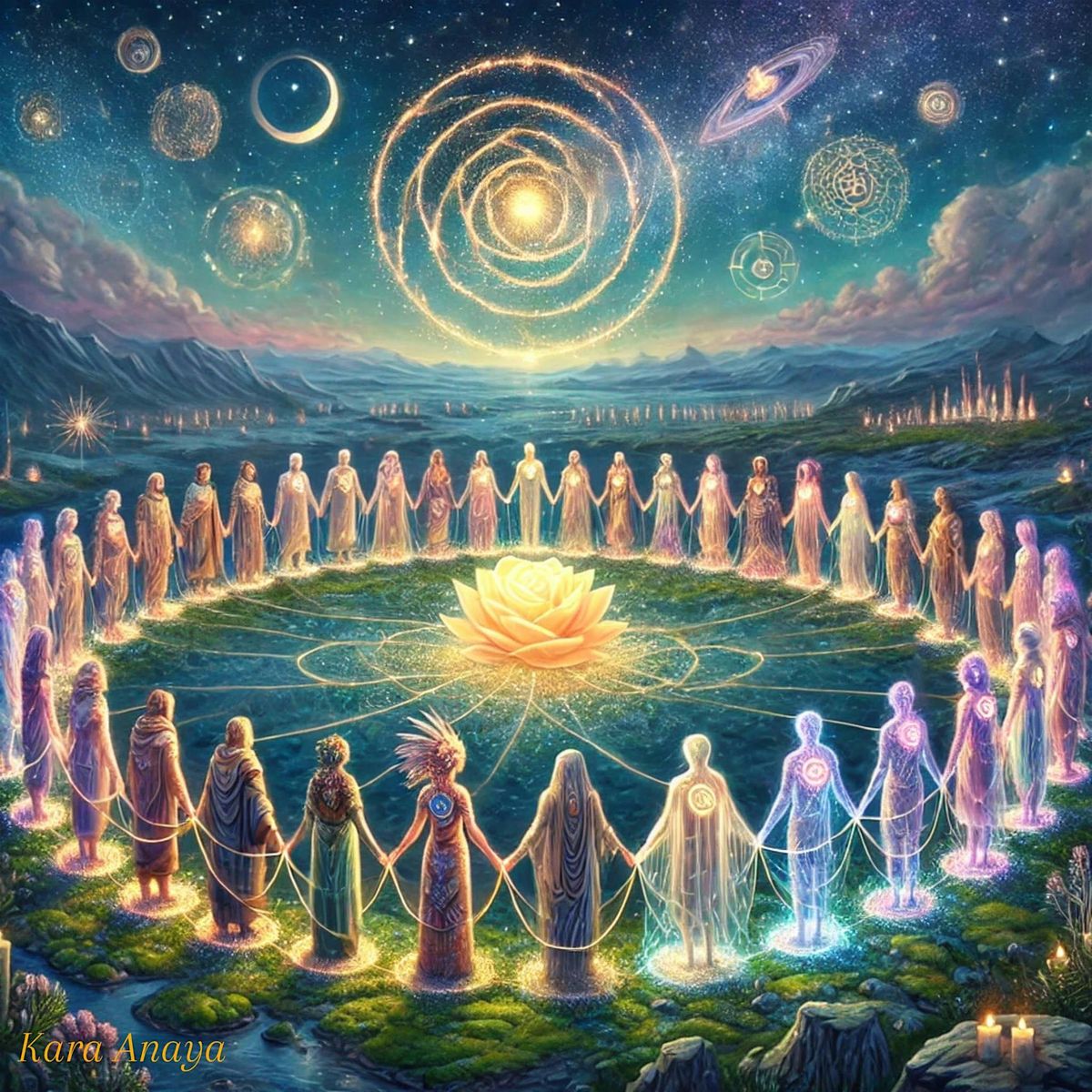 We sit in sacred circle and invite in the higher frequencies from all realms, all dimensions. Kelly is an oracle, channeler, and healer. (We all are.)