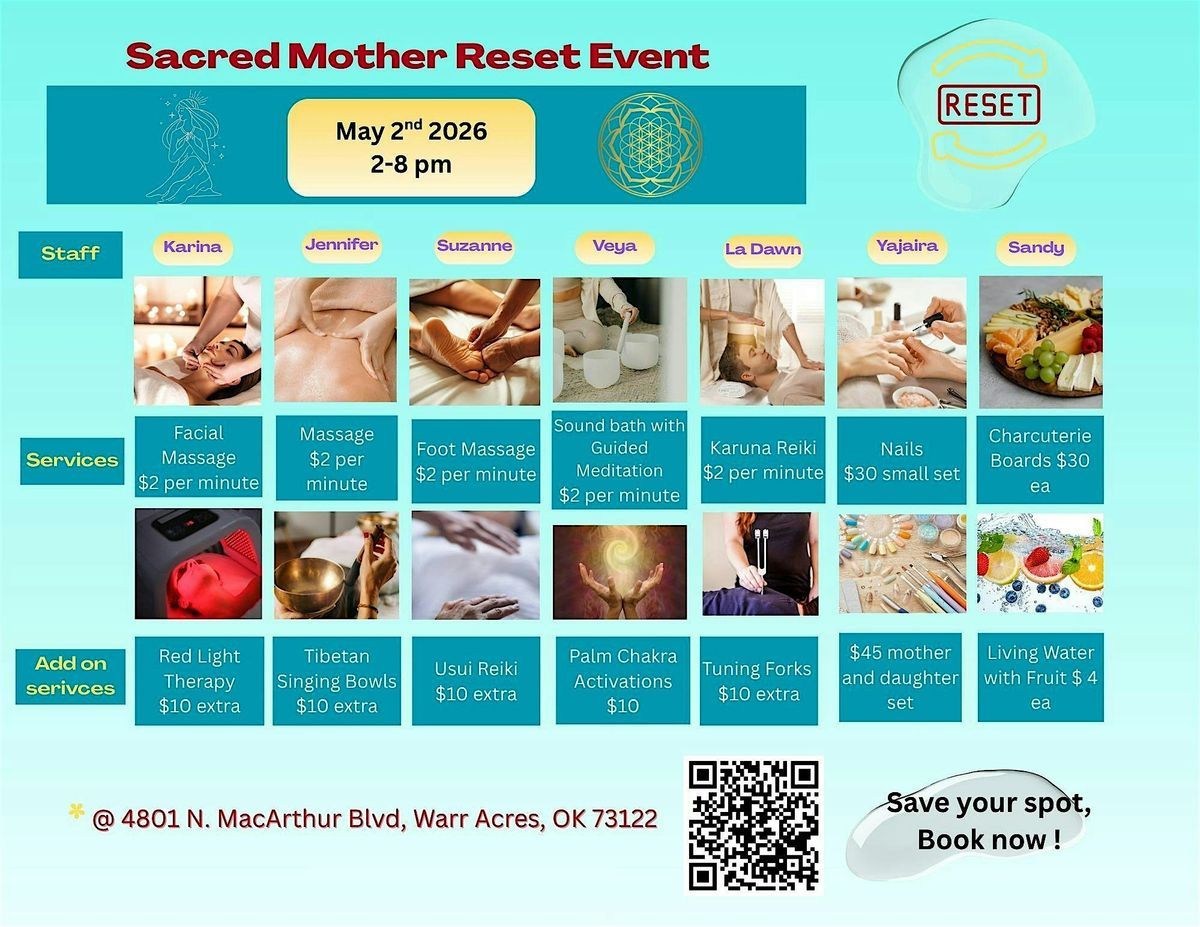 Hey there! Ready to hit the refresh button? Join us in person for the Sacred Mother Reset — a chill, uplifting event designed to help you reconnect and recharge your energy. Expect good vibes, meaningful moments, and a chance to reset your mind and spirit. Don’t miss out on this unique experience to nurture yourself and celebrate the sacred within!