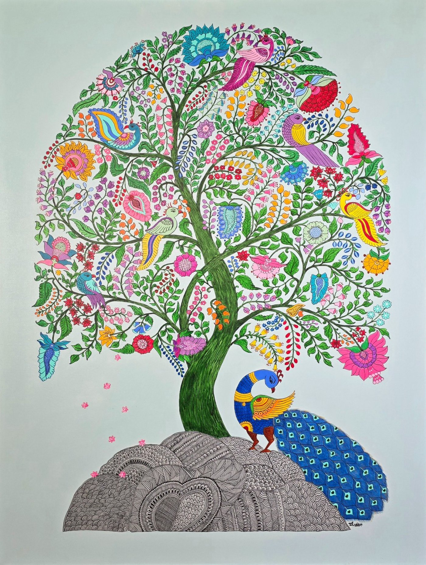 In Sacred Roots, the symbiotic relationship between ancient heritage and the natural environment takes center stage. Drawing from centuries-old Indian art forms, this solo exhibition celebrates nature not as a backdrop, but as a primary protagonist. From the regal display of stylized peacocks to the fluid movements of aquatic life, each work serves as a testament to the belief that every living being carries an essential story.