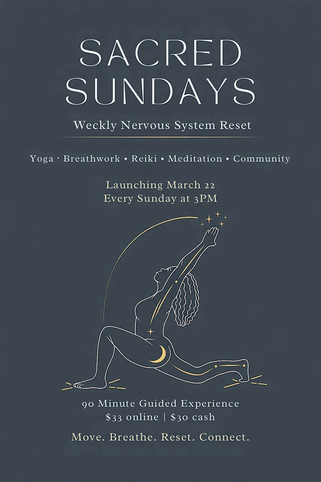 Sacred Sundays is a weekly space to slow down, reconnect, and reset before the new week begins. This 90-minute guided experience blends gentle yoga, breathwork, meditation, and energy healing practices to help regulate the nervous system and bring you back into balance. Whether you are feeling overwhelmed, disconnected, or simply want intentional time for yourself, this is a space where you can arrive exactly as you are.