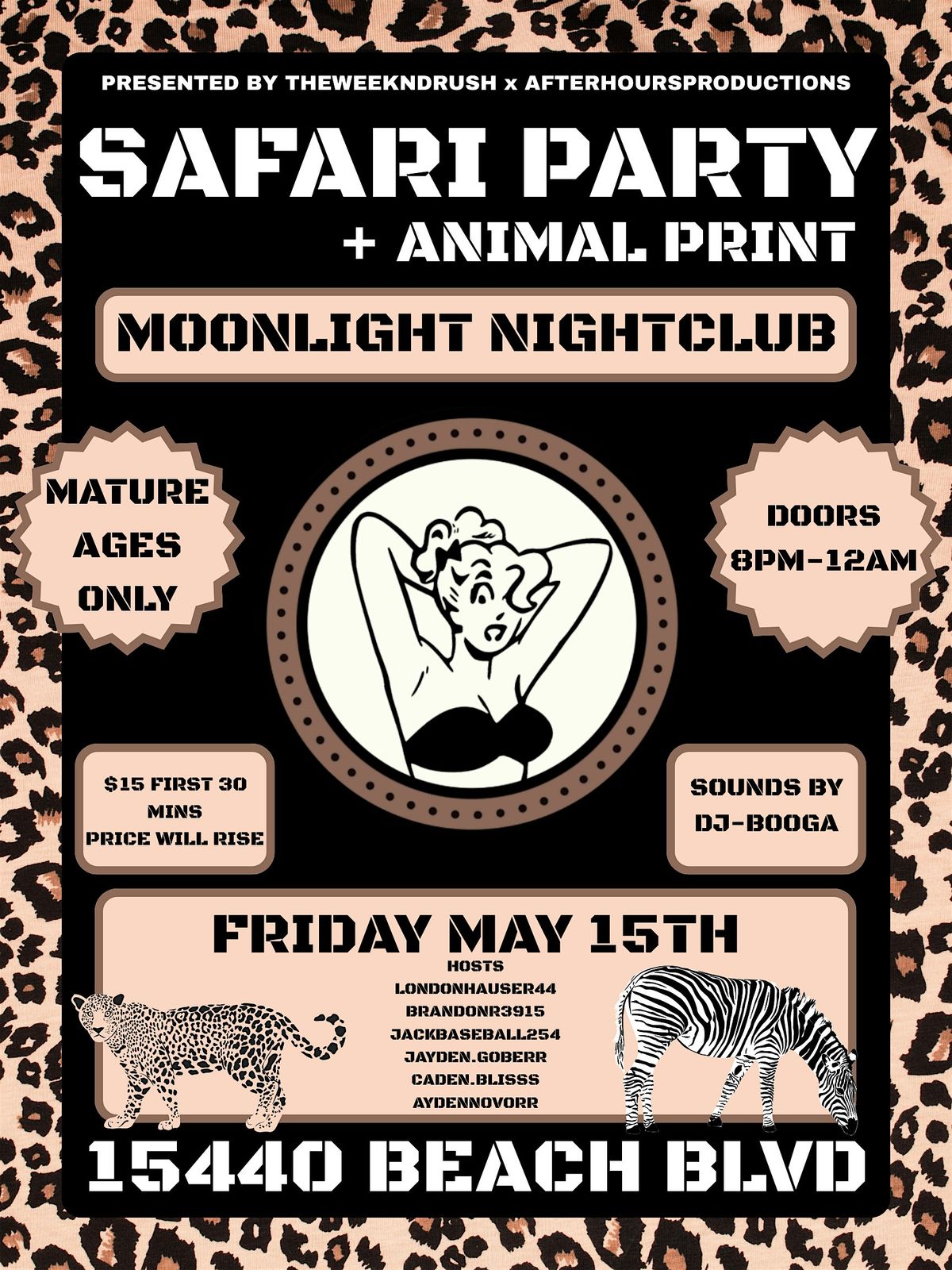 Step into the wild 🌿🐆 Join us May 15th for a Safari Party + Animal Print takeover at Moonlight Nightclub. Dress bold, bring the energy, and get ready for a night of untamed vibes, music, and unforgettable moments.