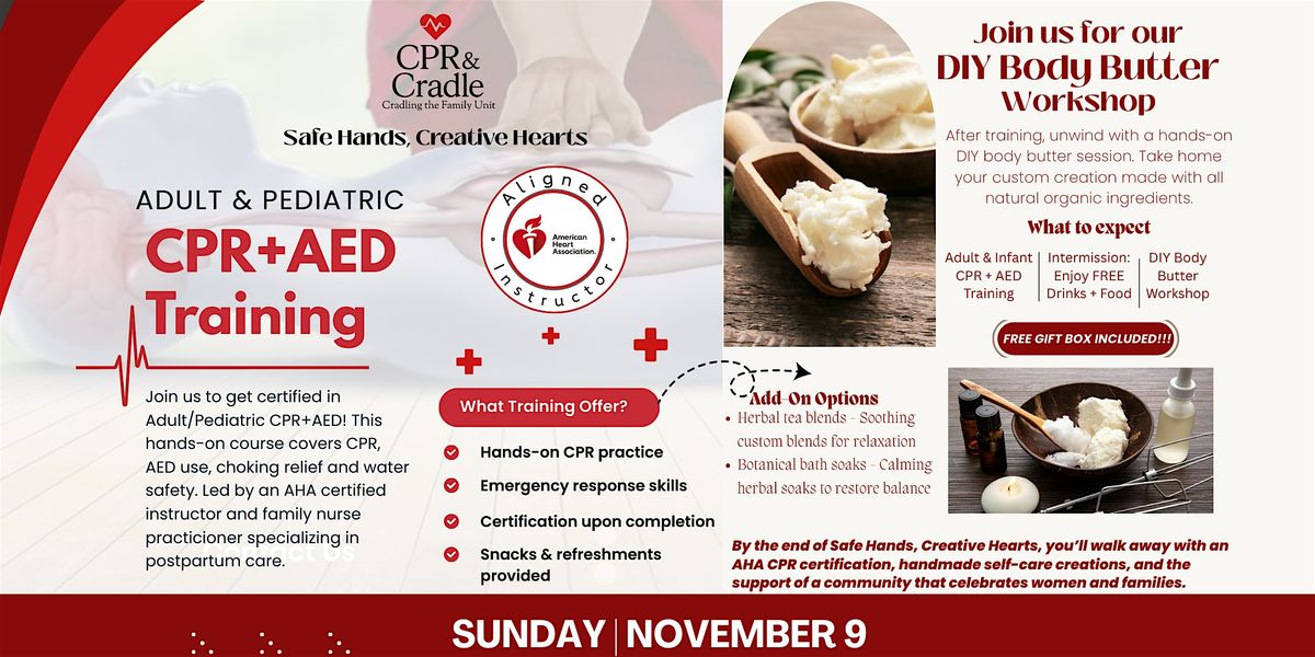 By the end of Safe Hands, Creative Hearts, you’ll walk away with an AHA CPR certification, handmade self-care creations, and the support of a community that celebrates women and families.