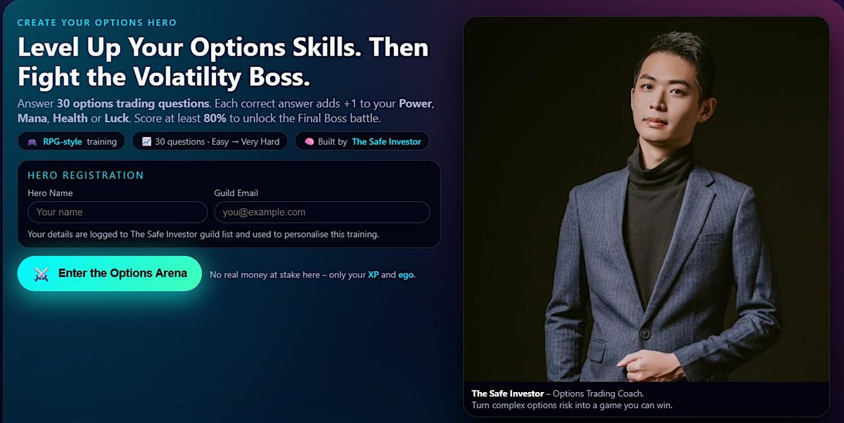 The Options RPG Arena is a risk-first training simulator created by The Safe Investor.