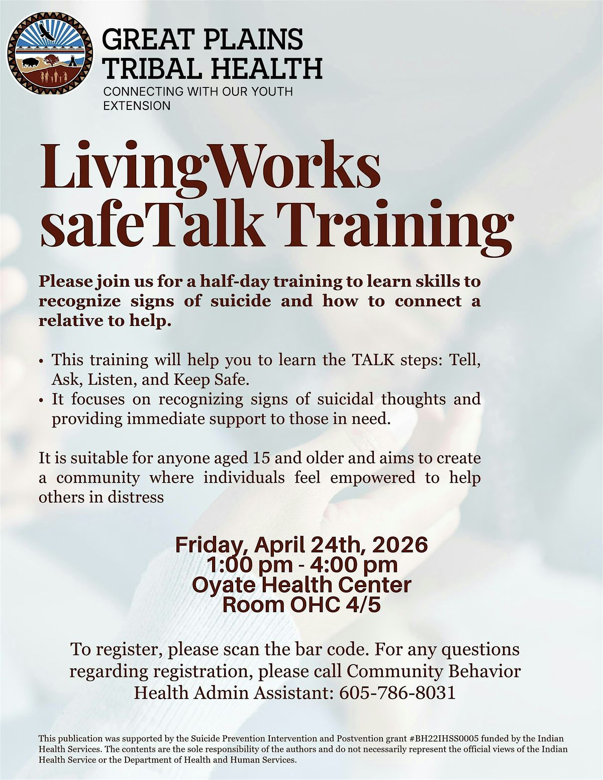 SafeTALK training is designed to teach individuals how to recognize and connect people who may be having thoughts of suicide. Participants learn the TALK steps: Tell, Ask, Listen, and Keep Safe. The training focuses on recognizing signs of suicidal thoughts and providing immediate support to those in need. It is suitable for anyone aged 15 and older and aims to create a community where individuals feel empowered to help others in distress.