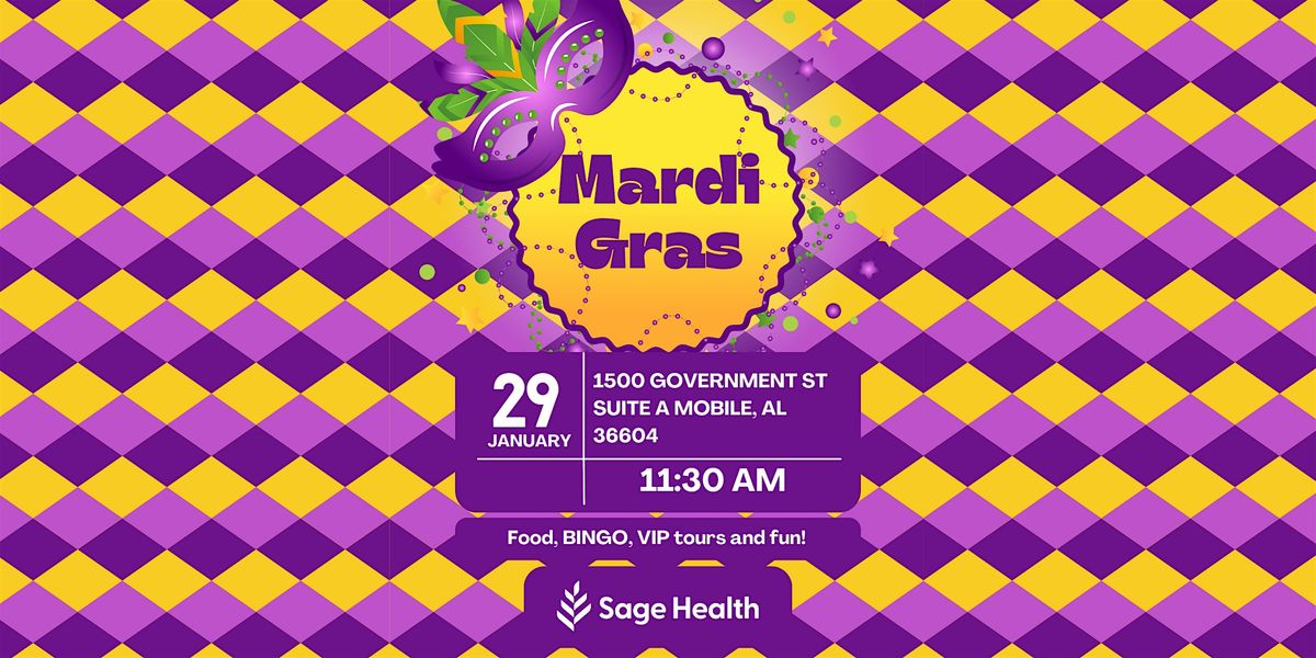 Welcome to Sage Health Midtown Mardi Gras! Get ready to celebrate with us at 1500 Government St, Suite A, on January 29, 2026, at 11:30 AM (Central Time). Let's enjoy a day filled with music, food, and BINGO. Don't miss out on this exciting event! VIP Tours are available as an add-on to your RSVP. This event is for adults 50+.