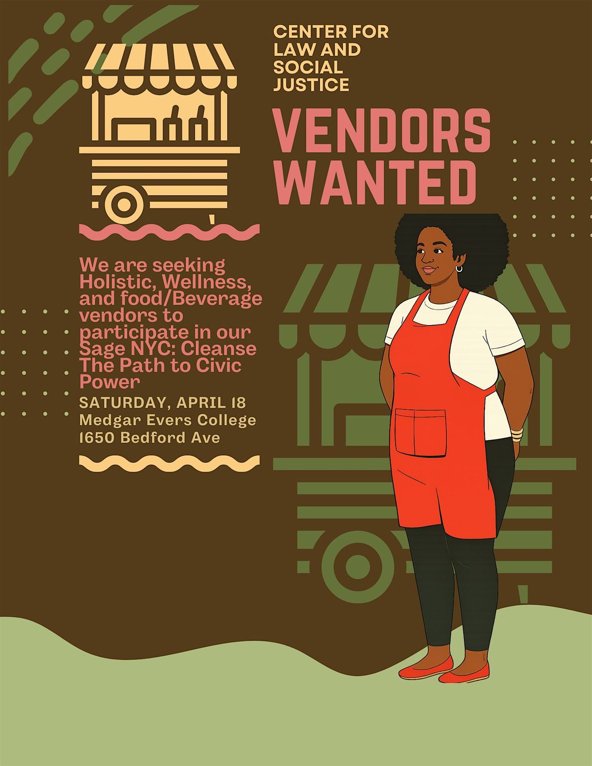 The Center for Law and Social Justice at Medgar Ever College is seeking vendors for Sage NYC for Saturday, 4/18.