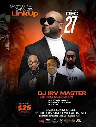 Hey! Ready to vibe in person with awesome Sagittariuses and Capricorns? Get ready for an unforgettable night as we celebrate DJ IRV’s birthday with the fantastic Dj's! We will have DJ FYAH OATS, DJ Max the Blazer, Dj ETN. Join us for a high-energy evening filled with Kompa rhythms, Reggae &Dancehall, Soca, Salsa, and more, Great vibes, and non-stop dancing.