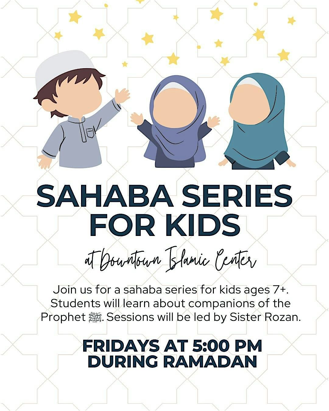 Join us for a sahaba series for kids ages 7+. Students will learn about companions of the Prophet ﷺ. Led by Sister Rozan. #ramadan
