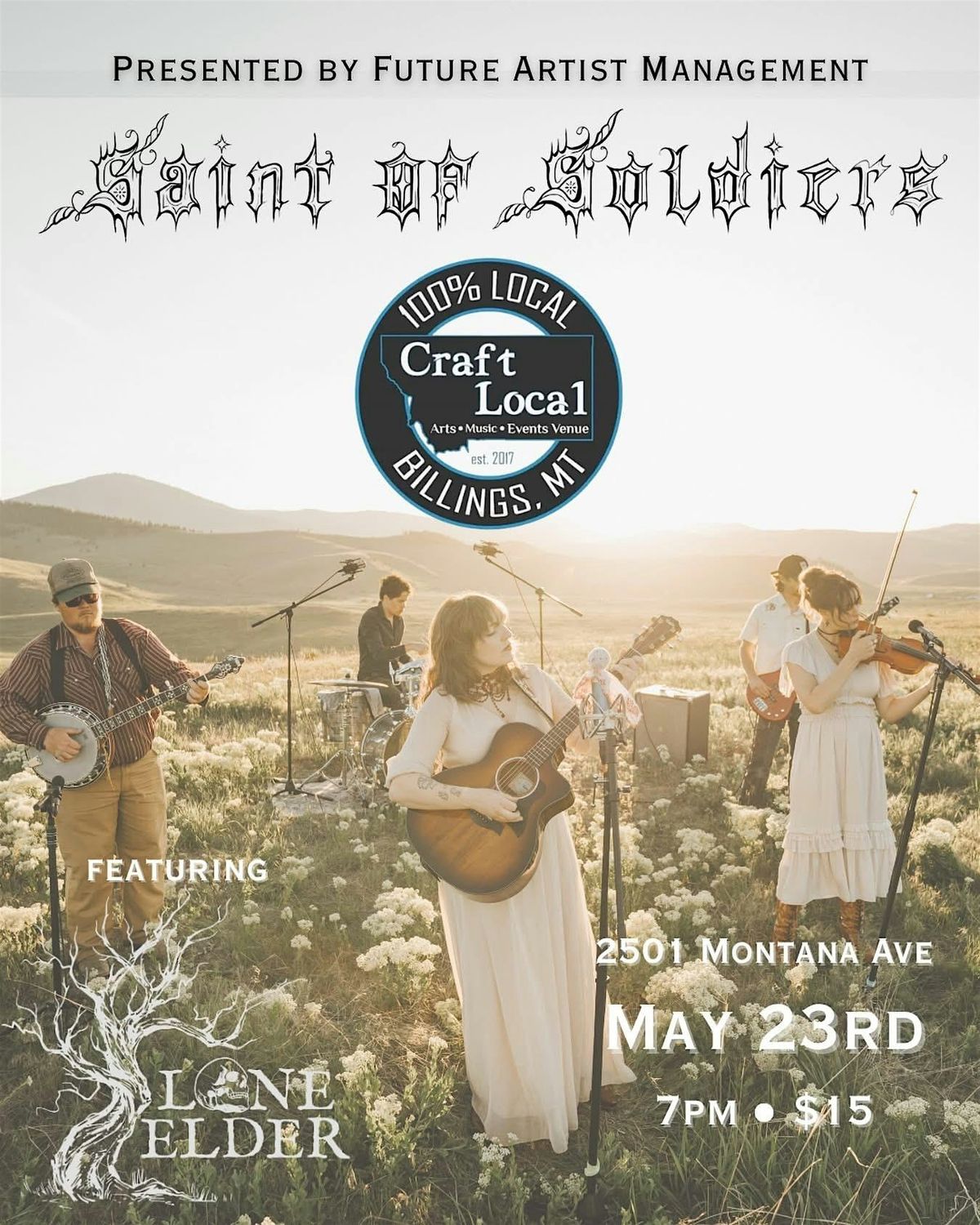 Saint of Soldiers is a five-piece band from Northwestern Montana, fusing indie rock grit with bluegrass soul to create music both haunting and angelic. With a penchant for the macabre and a reverence for Montanaโs landscapes and history, their songs carry stories of resilience, heritage, and the untamed spirit of the Northern Rockies.