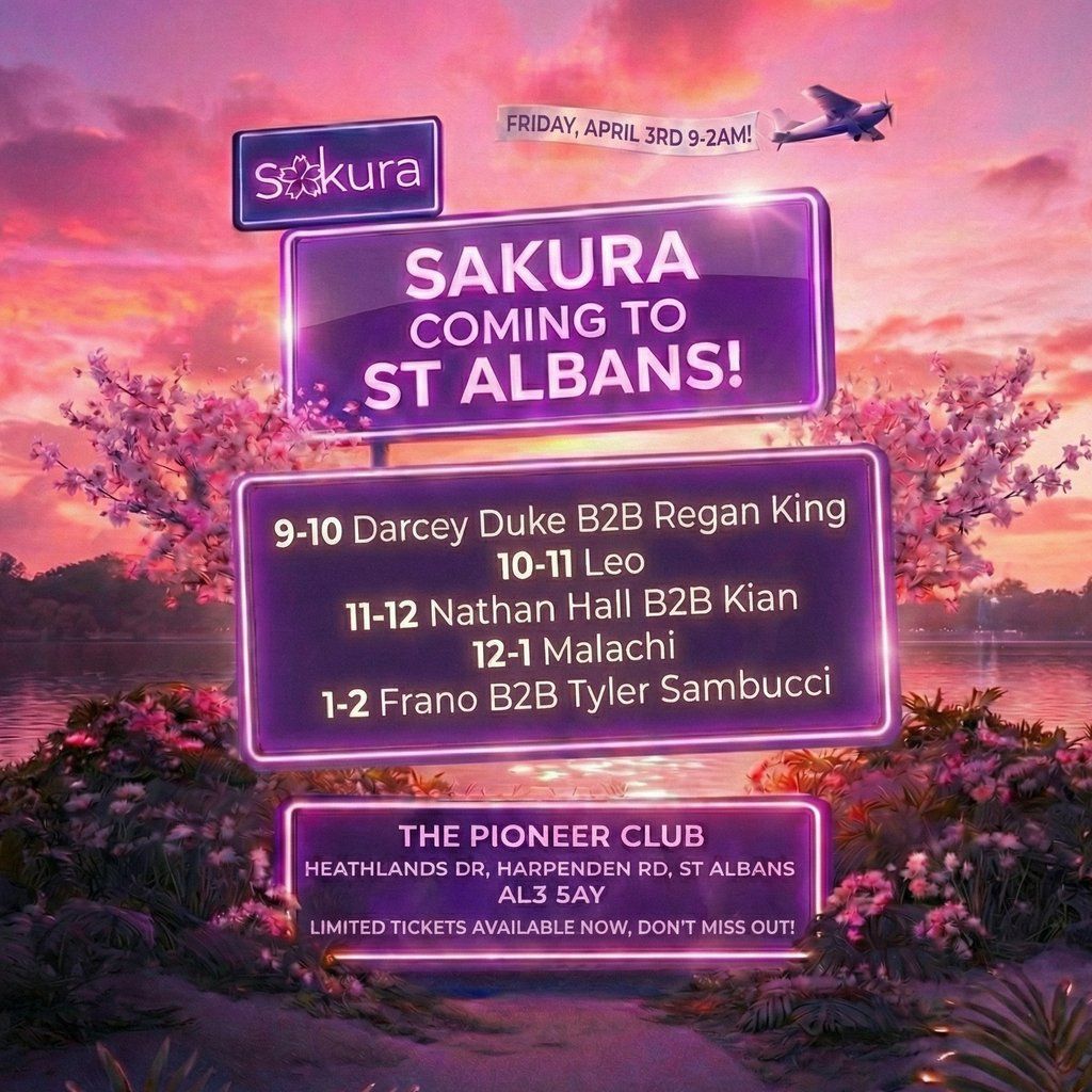 Sakura lands in St Albans for a night of pure house and tech house energy. Join us at The Pioneer Club on April 3rd from 9PM-2AM!Music Genres : House, Deep House, Tech House