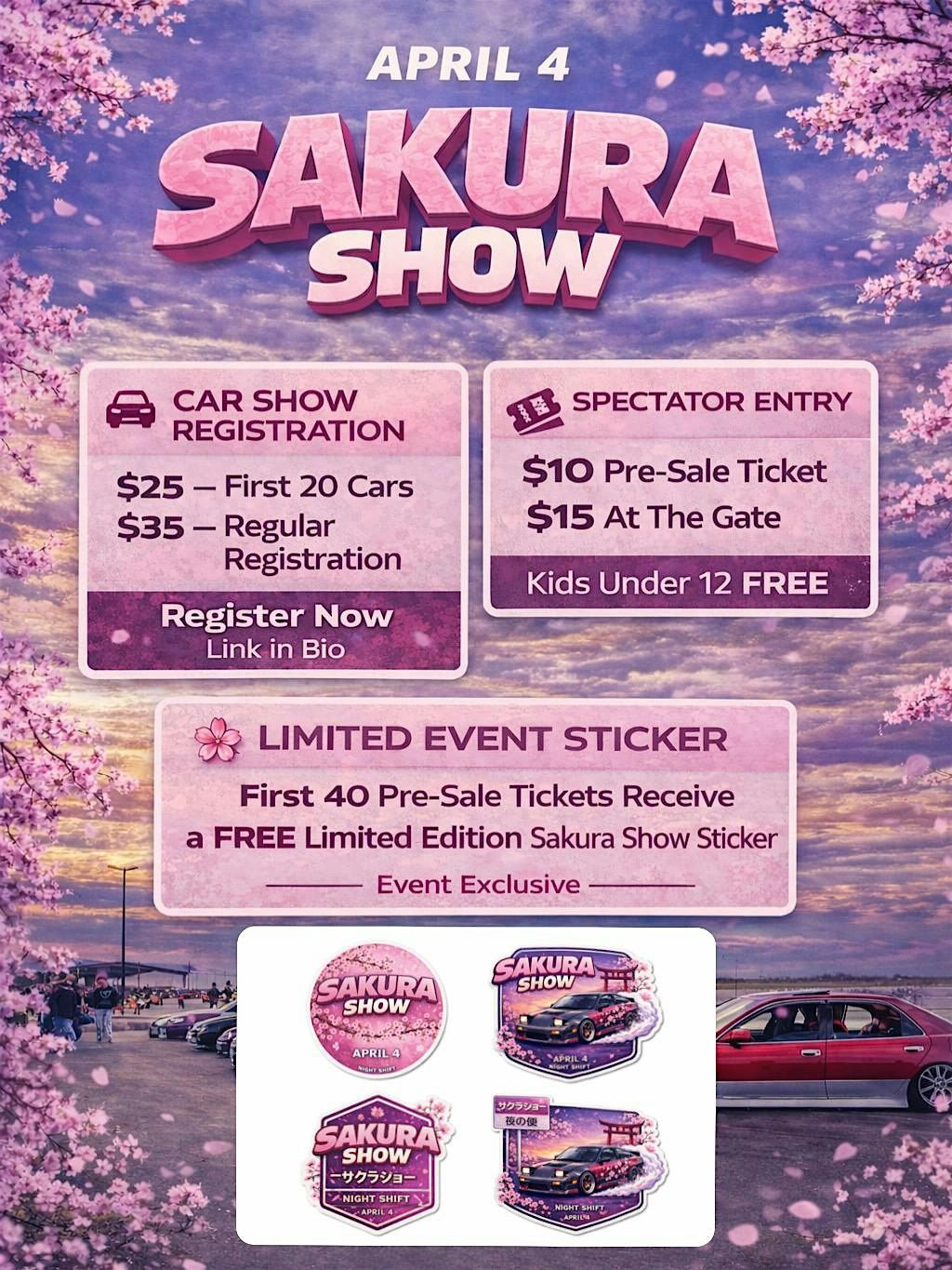 Hosted at Cams Training Facility, Sakura Show is built to create a full experience for both drivers and spectators. Expect a curated lineup of show cars, featured drifters, ride-alongs, vendors, media coverage, and a strong mix of JDM, Euro, Domestic, and custom builds all set against a clean spring-inspired atmosphere.