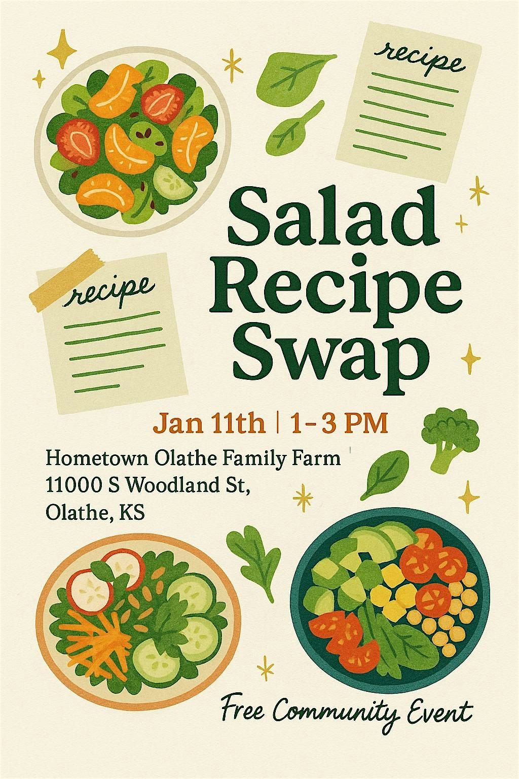 Jan 11 | 1–3 PM ✨ Salad Recipe Swap at Hometown Olathe Family Farm. Bring a recipe, trade ideas, sip drinks & start the year fresh. Free!