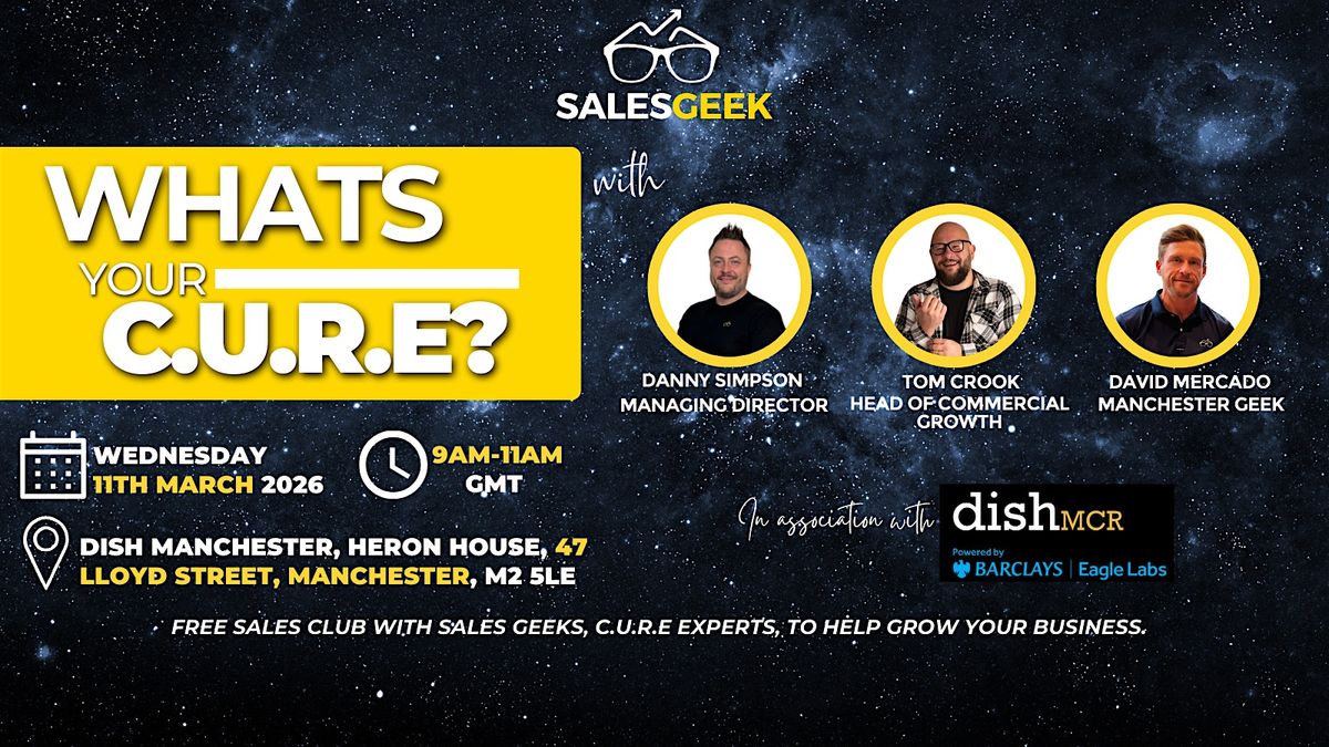 The Great Manchester Sales Club takes place at the DiSH Manchester, Heron House, 47 Lloyd Street, M2 5LE, and focuses on the theme: What is your C.U.R.E?