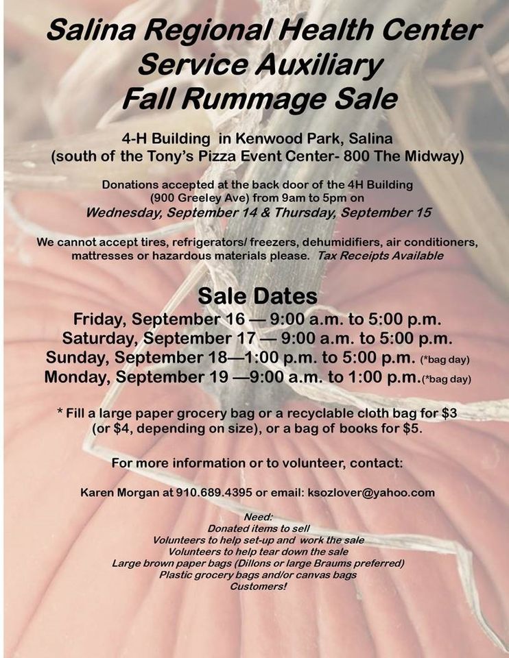 Join us for the Salina Regional Health Center Service Auxiliary Fall Rummage Sale! Shop for items you want while supporting your Salina hospital. Purchases made at this sale go towards improving Salina Regional Health Center and services, including operational support of the Rebecca A. Morrison House, healthcare scholarships and more.The other part to this sale happens before the sale dates – if you have items which you would like to donate to the sale, donations can be made between 9am and 5pm on either Wednesday, September, 14, or Thursday, September 15 at the 4-H Building, 900 Greeley Avenue, Salina. See less