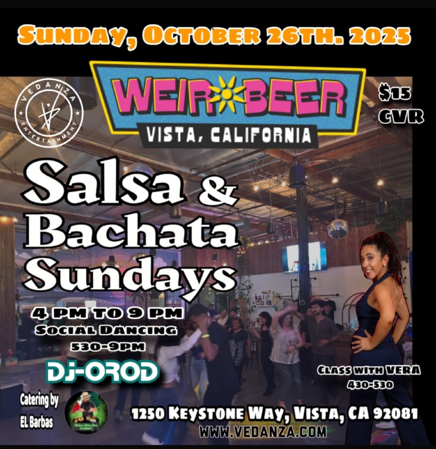 Unleash your inner dancer at "Salsa & Bachata Dancing in Vista" brought to you by DJ Orod Join us at Weir Beer located at 1250 Keystone Way Vista CA 92081 United States Vista on October 26Get ready to immerse yourself in the rhythmic beats of salsa and bachata music expertly curated by DJ Orod. This event is a vibrant celebration of Latin dance culture open to dancers of all levels. Whether you're a seasoned pro or just starting out this event promises an unforgettable evening of dance laughter and connection.