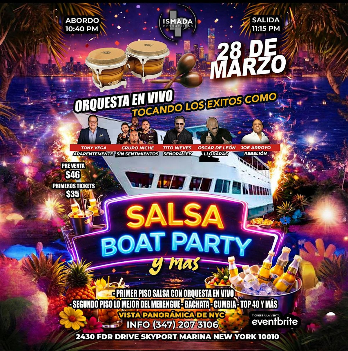 Este sábado 28 de mazo 2026 navegando por Nueva York con la mejor fiesta de vallenato en vivo y la energía latina que te hará bailar toda la noche. ¡No te pierdas el Salsa Boat Party mas fiesta atina