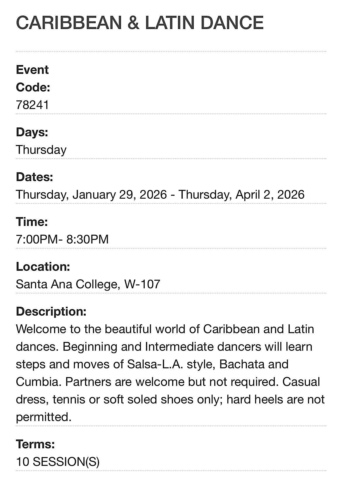10 Week Salsa Class. Santa Ana College on Thursdays at 7pm for 10 weeks. Introductory Salsa Class starting January 29th 2026.