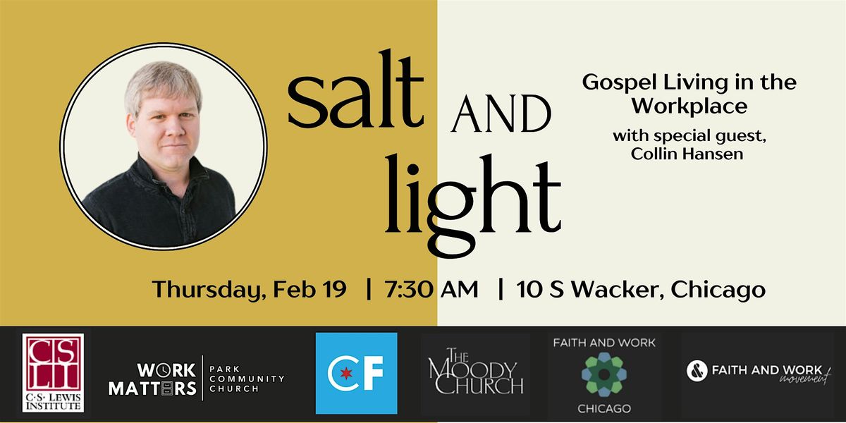 Join us for a unique Salt and Light gathering as we partner with the Chicago Fellowship (CF) for a special event! We're hosting Collin Hansen, the VP for content and editor-in-chief of The Gospel Coalition and the executive director of The Keller Center for Cultural Apologetics, and we have invited the Chicago Fellowship to join us.