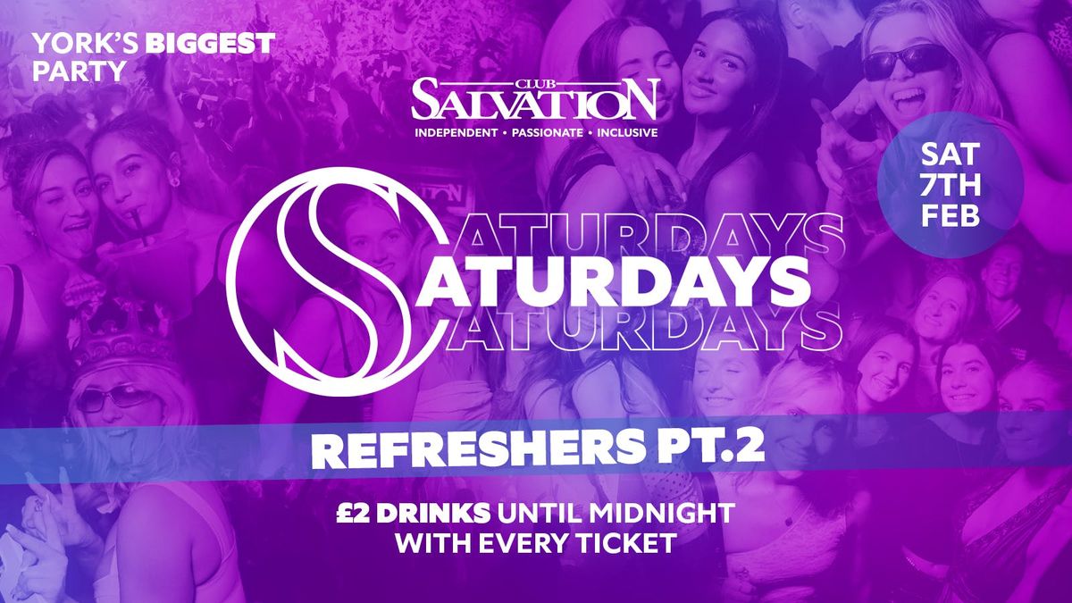 Saturdays at Club SalvationMassive Tunes. Incredible vibes. Unforgettable Nights.York's Refreshers 2026 Part 2 🎉🎵 YORK’S BEST DJS, EVERY SATURDAY🚀 3 ROOMS, 3 VIBES - ONE HUGE NIGHT🎉 CONFETTI CANNONS & NON-STOP ENERGY📸 PROFESSIONAL CAMERA CREW✨ FREEBIES & GIVEAWAYS