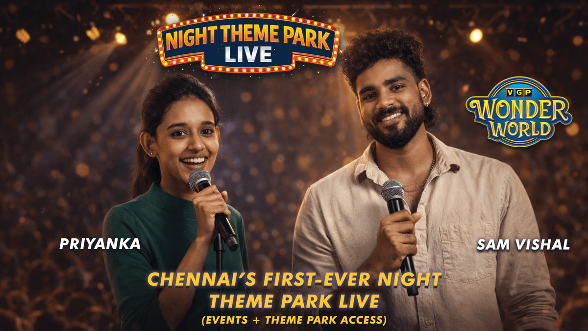 Experience Chennai’s first-ever night theme park concert with the Sam Vishal and Priyanka! Enjoy access to Sam Vishal & Priyanka's live concert, trampoline park, water park, 15+ dry games, zip-line cycles, and more - all under one ticket.This unique event blends live music, thrilling rides, night park ambience, food zones, and festival activities to create an unforgettable family experience. From DJ nights and performances to vibrant carnival energy and party vibes, the night promises non-stop entertainment for all age groups.