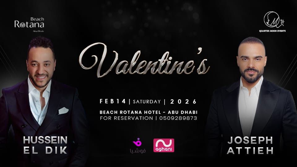 Celebrate Valentine’s Night with a one-night-only luxury Arabic concert and fine dining experience. Join Hussein Al Deek and Joseph Attieh, two of the Arab world’s most celebrated artists, for an elegant indoor seated concert paired with a gourmet full-course dinner in the prestigious Al Thuraya Ballroom at Beach Rotana Abu Dhabi.