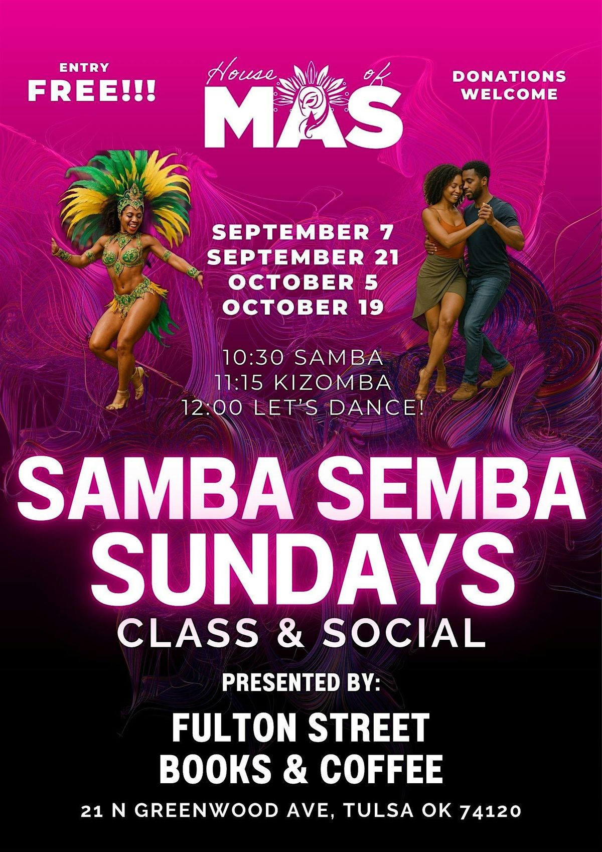Fulton Street Books & Coffee will be hosting House of MAS Sunday dance classes for 4 special weekends in September and October.