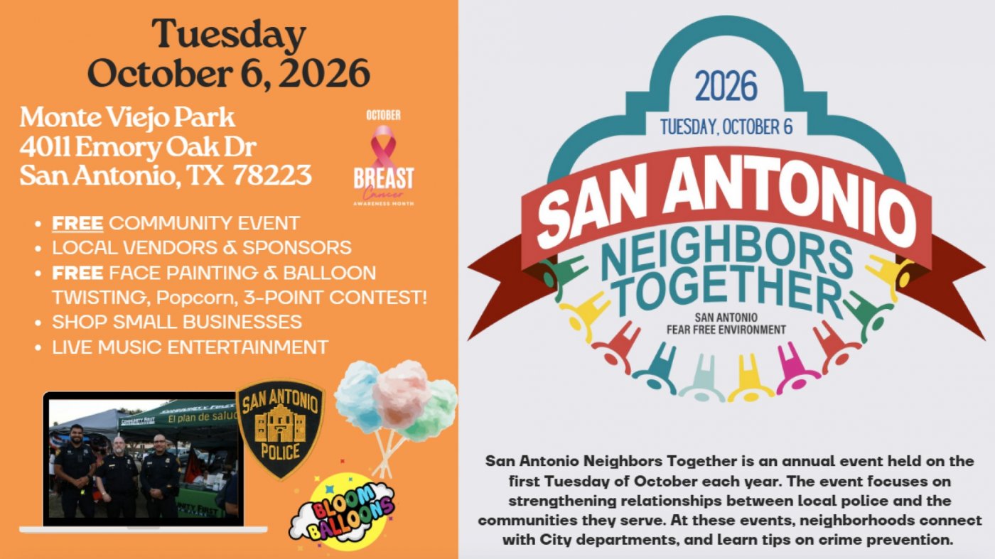 San Antonio Neighbors Together is an annual event held on the first Tuesday of October each year. The event focuses on strengthening relationships between local police and the communities they serve. At these events, neighborhoods connect with City departments, and learn tips on crime prevention.We will have local small business vendors, resource vendors, live music, food and more so come on out, bring your blankets and lawn chairs, meet your neighbors and enjoy!!